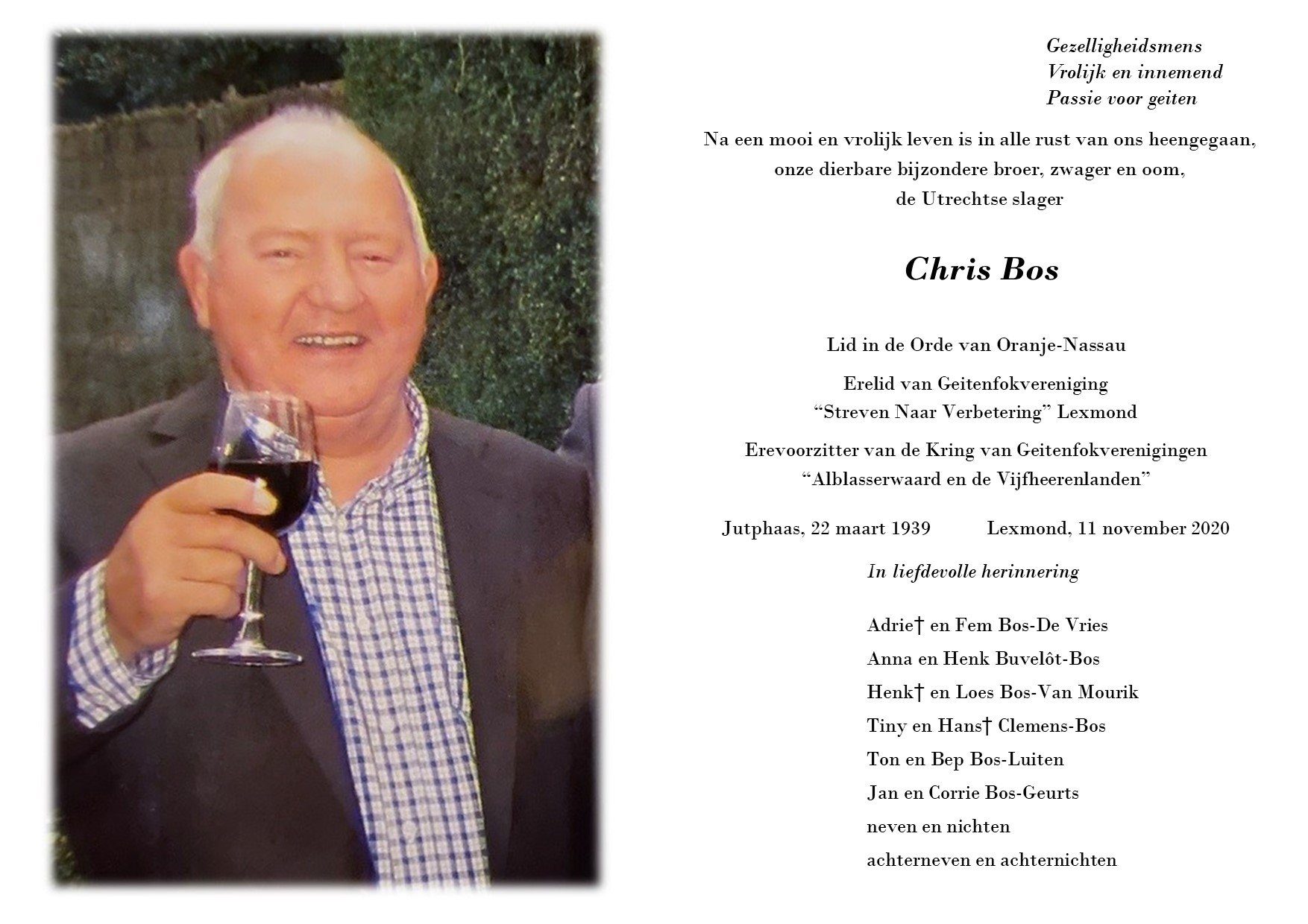 Chris Bos is er niet meer, na een strijd tegen falende nieren en andere ongemakken. Het is eigenlijk niet te geloven dat Chris er niet meer is. Op alle gelegenheden waar maar iets te doen was met geiten, was hij present.